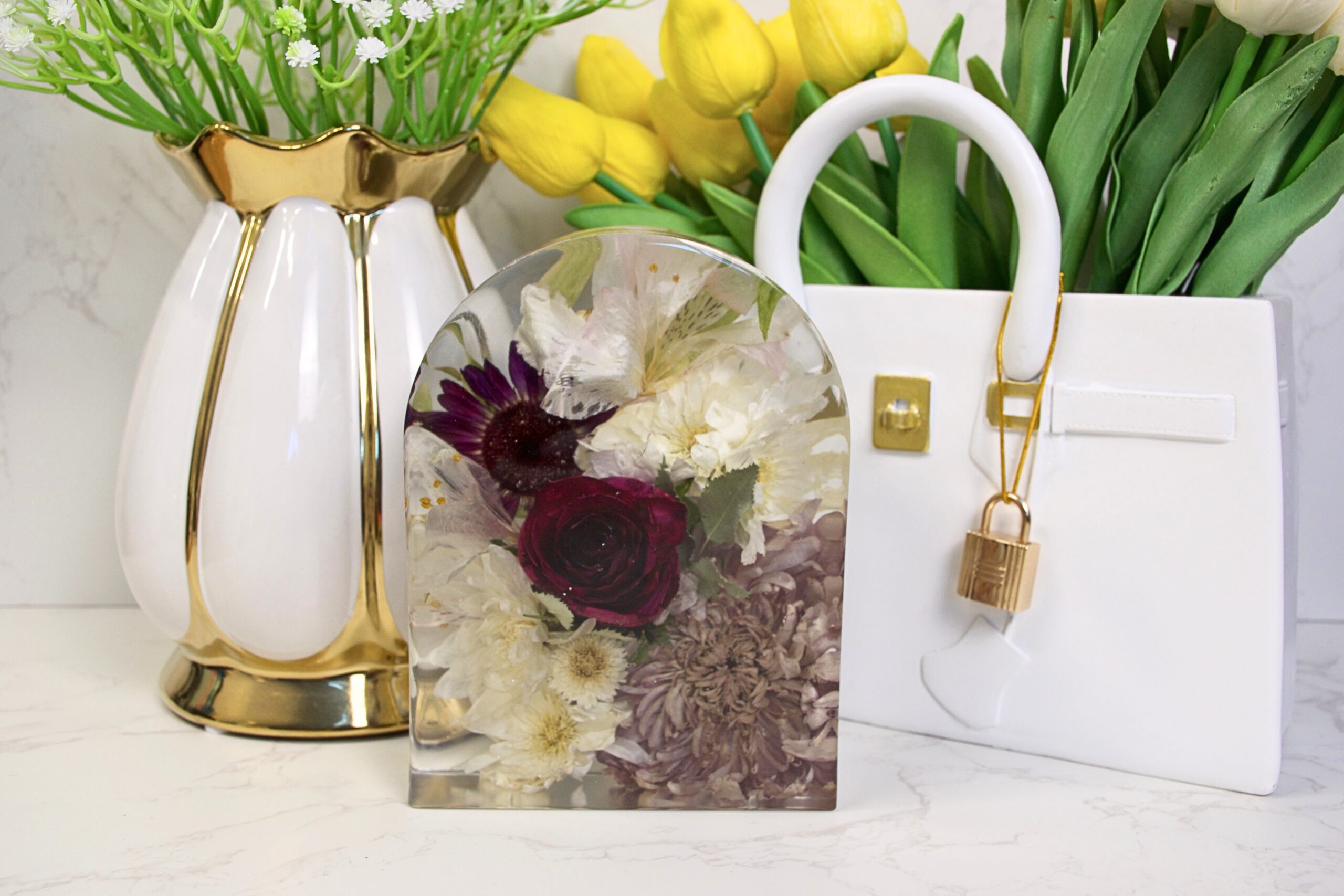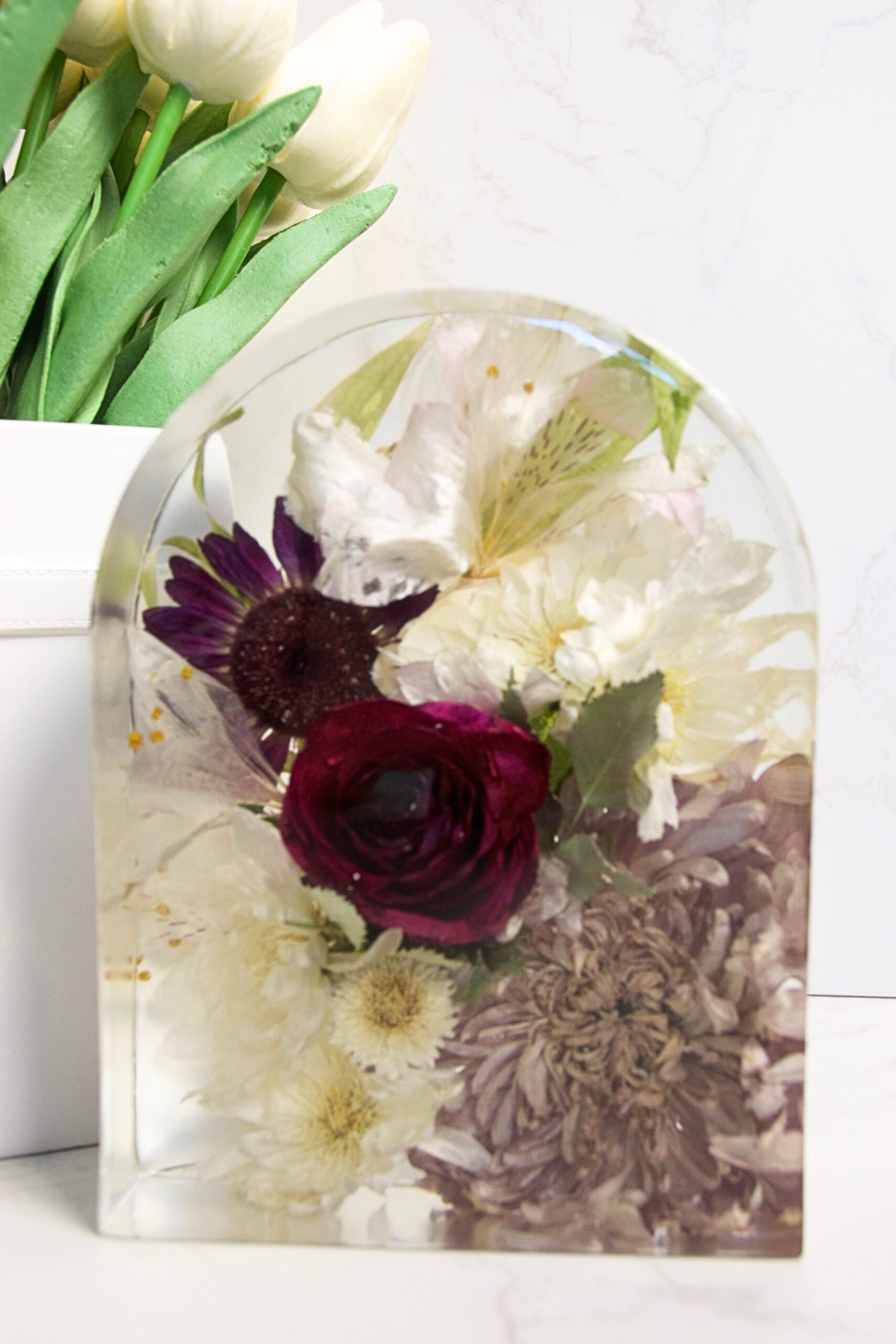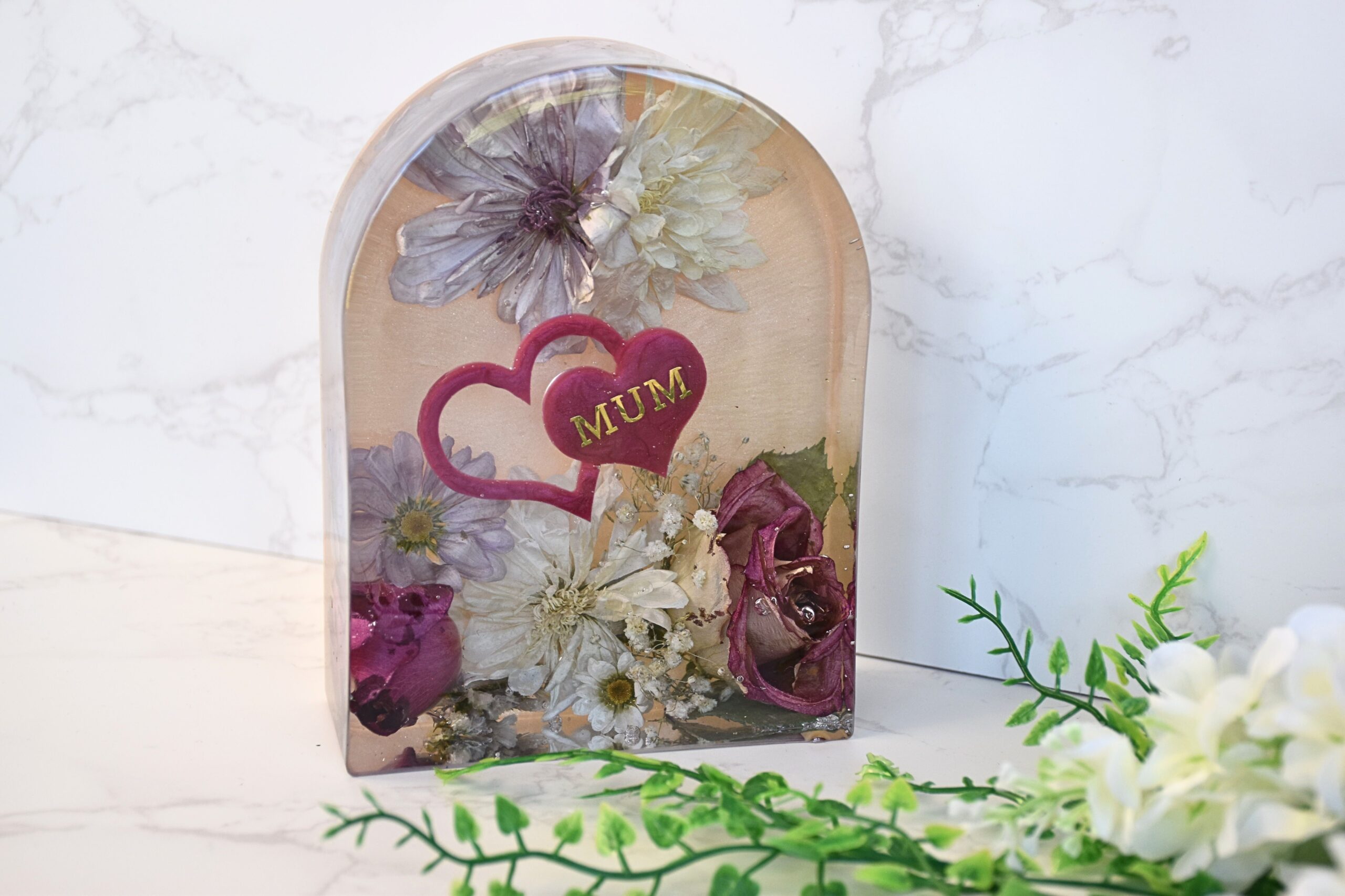 Our beloved Resin Arch block are stunning statement pieces, perfect for displaying your bouquet, special occasion, or memorial flowers. Available in three versatile sizes, they beautifully showcase flowers and foliage of every shape and size, turning your cherished blooms into a centrepiece that truly captivates.  Personalisation brings a unique and heartfelt touch to the keepsake.