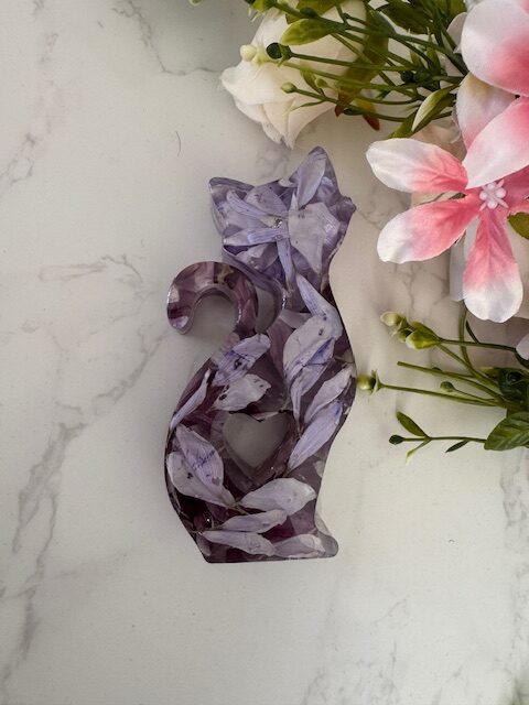 A beautiful resin cat, enchanting and magical, delicately designed to showcase petals, small flowers, and foliage. This charming piece makes a wonderful gift and is perfect as a flower preservation keepsake, turning treasured blooms into a lasting, captivating memory.