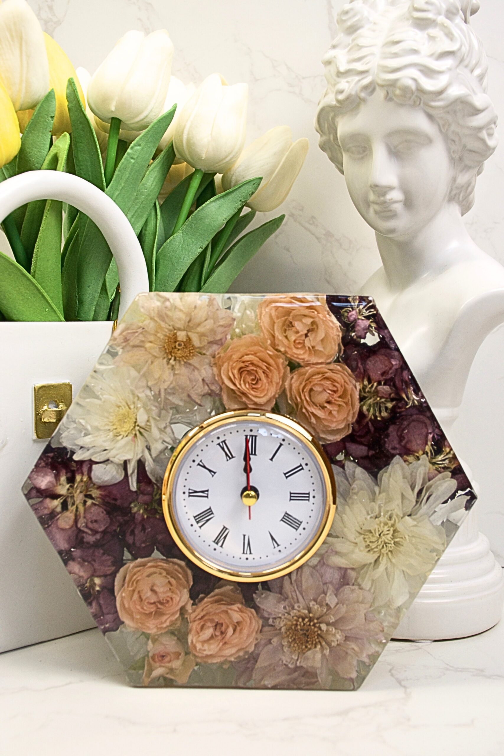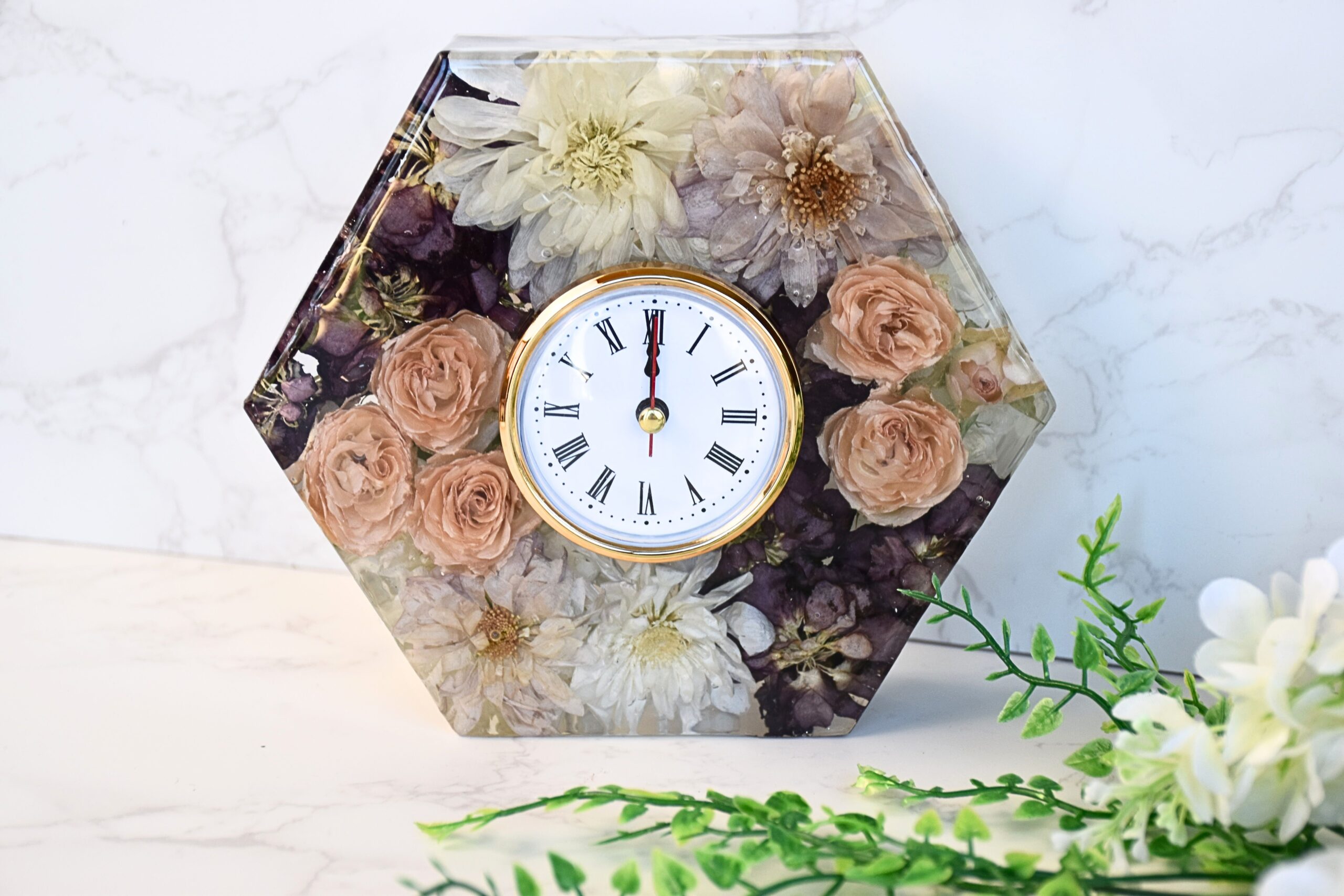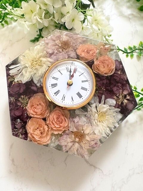 A timeless resin hexagon clock, exquisitely crafted and breathtaking from every angle, designed to elevate any space with understated luxury. This elegant keepsake beautifully preserves bridal, special occasion, or memorial flowers, turning cherished blooms into a romantic, everlasting tribute filled with sentiment and meaning.